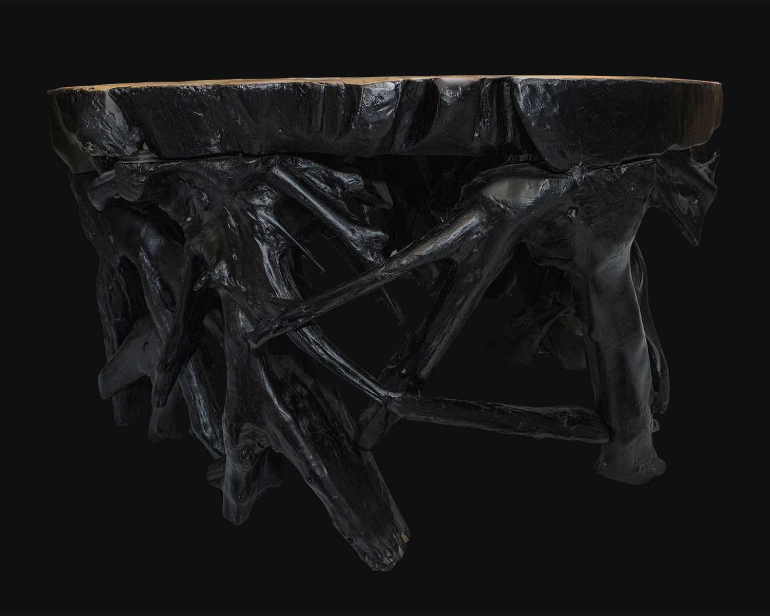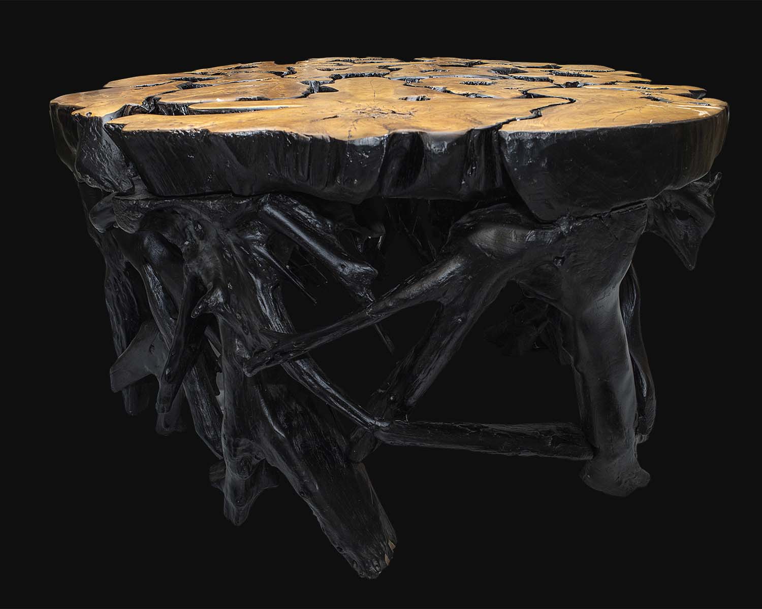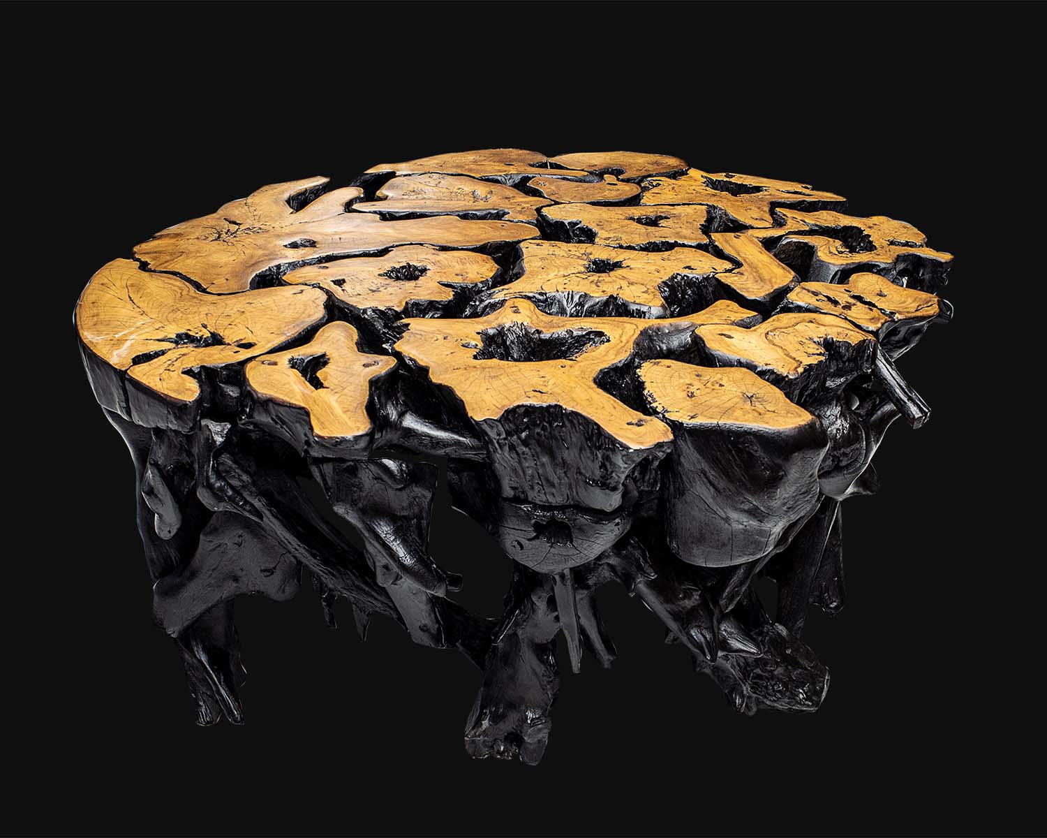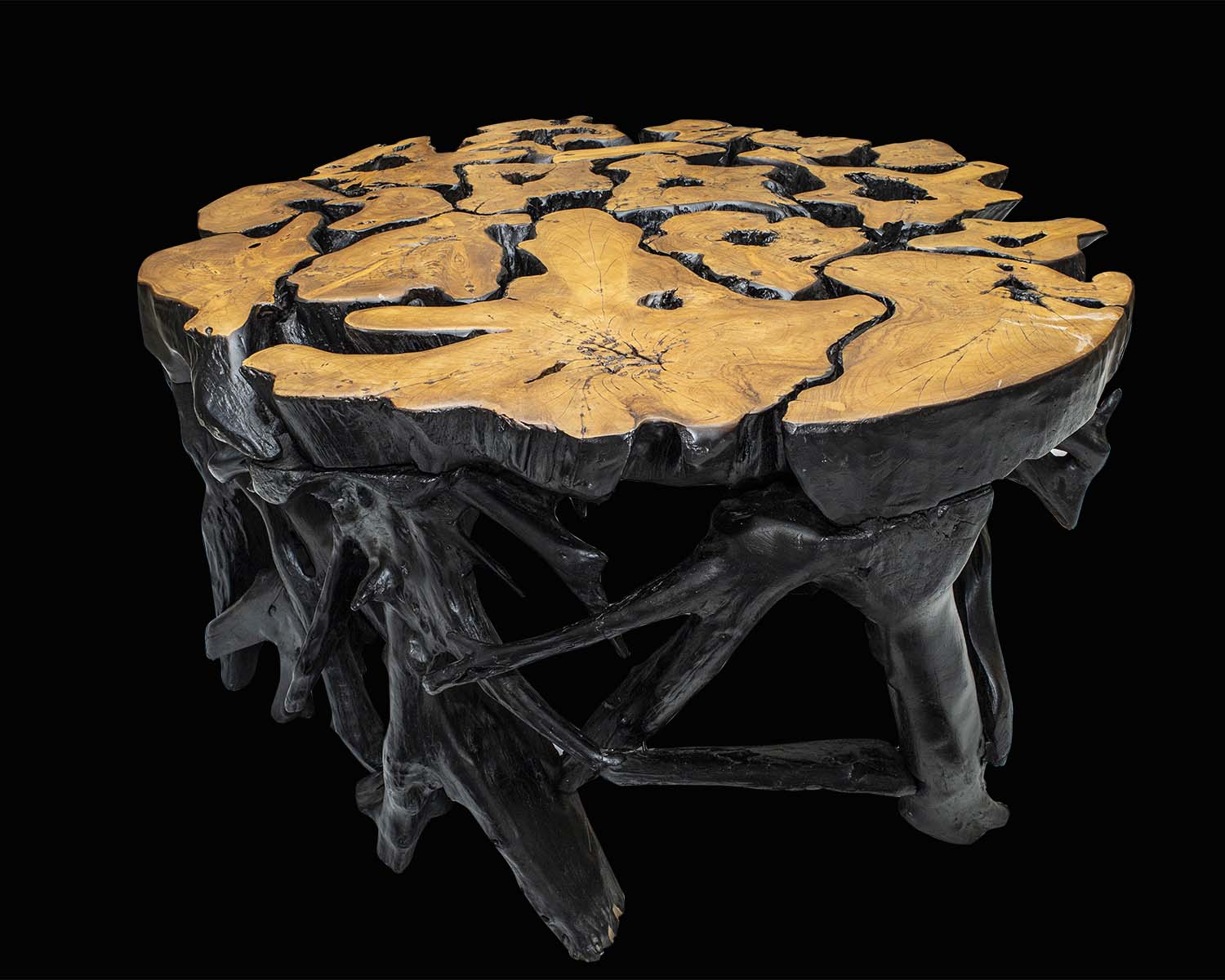 The tabletop reveals a striking, fragmented landscape of teak grain—warm, golden, and richly expressive—while the base emerges beneath like a sculptural network of roots, darkened and polished to a near-ebony finish. The contrast creates a powerful visual tension: raw nature refined into architectural elegance.