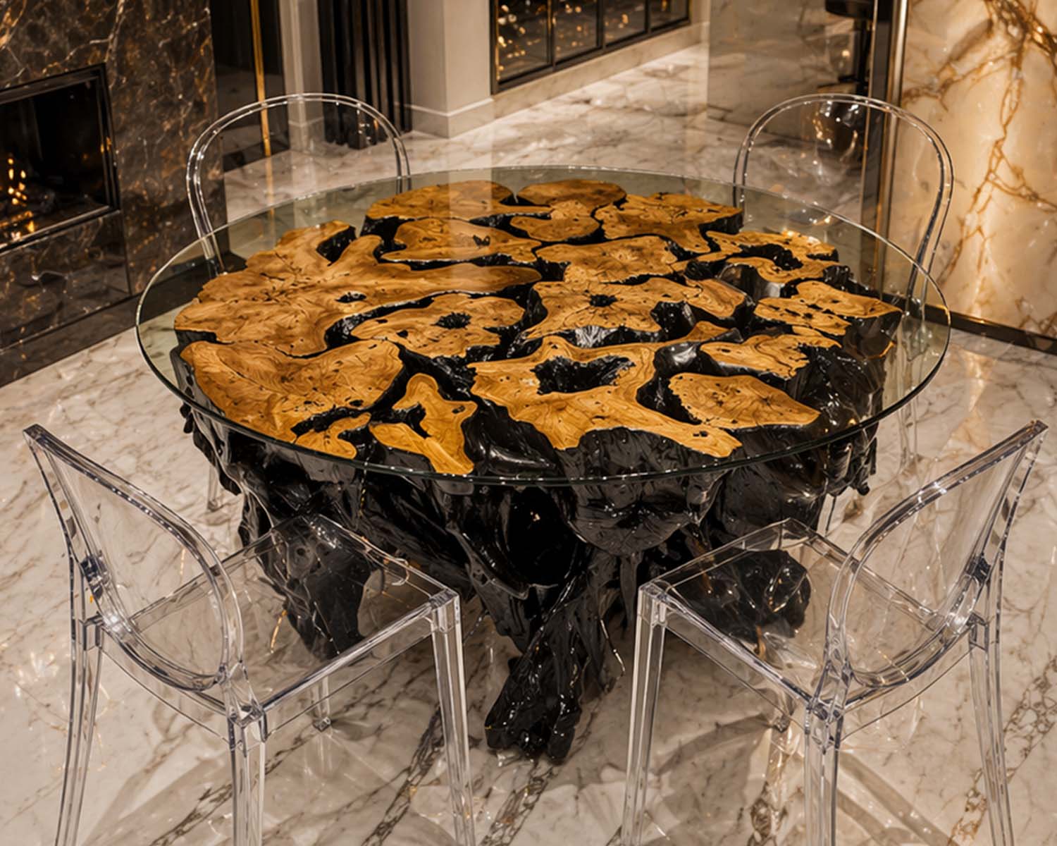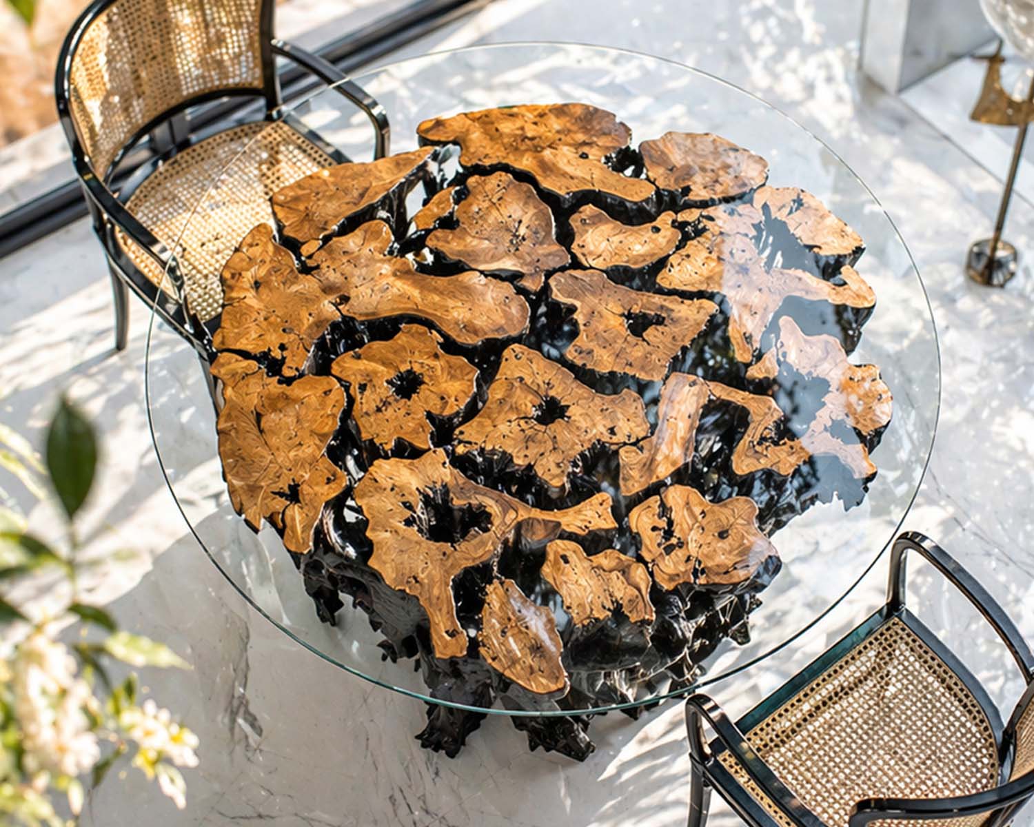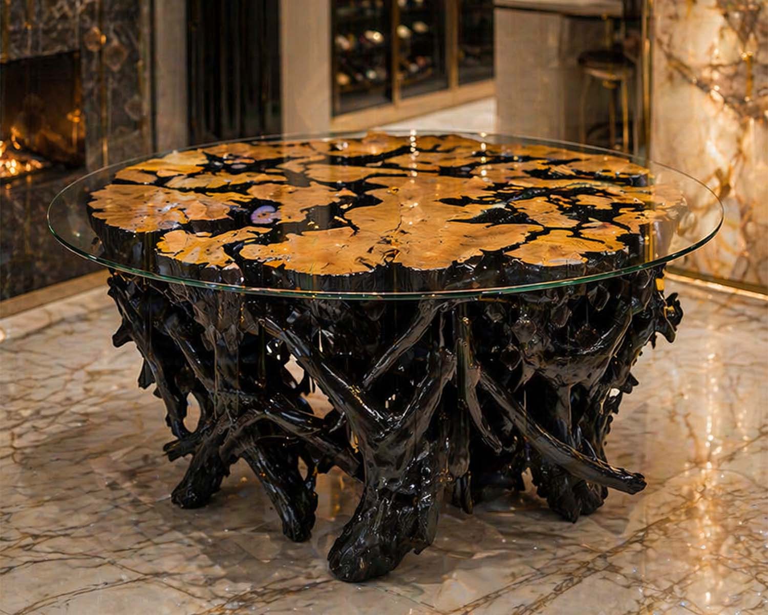 Crowned with a precision-cut clear glass top (180 cm diameter), the design achieves a sense of weightlessness. The transparency allows the intricate root structure to remain fully visible, transforming the table into a floating centerpiece—both grounded and ethereal.