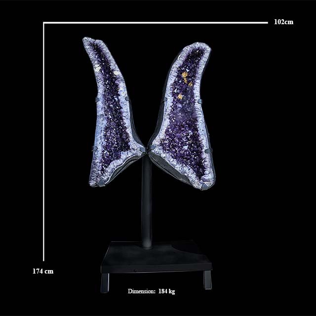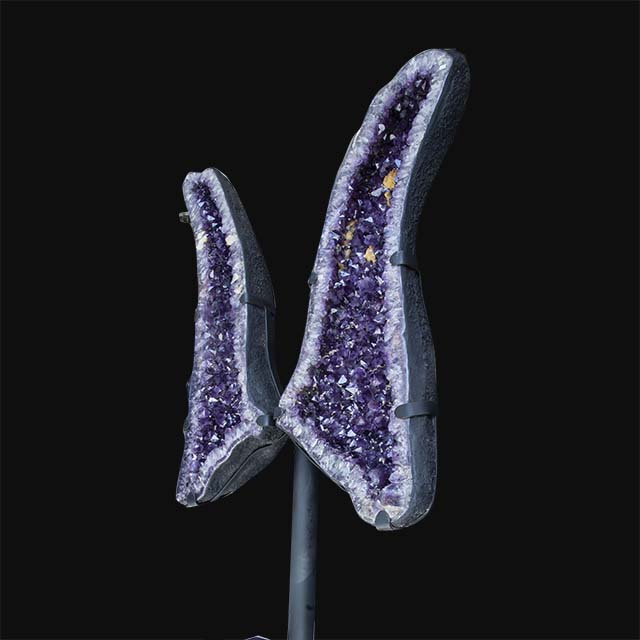 This lovely home decor accessory consists of two big Amethyst quartz crystal cluster geodes. The two specimens were a single geode that was split and are placed together on the metal stand to display as a pair of Amethyst butterfly wings