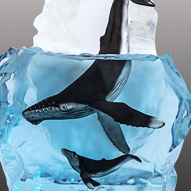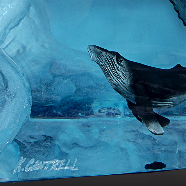 A humpback whale and her baby glide through the chilled waters in unity. Bonded by nature, these two kindred souls are forever connected. This sculpture is made of beautiful Lucite with highly detailed bronze embedment.