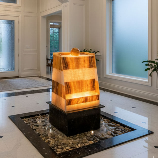 This stunning and luminous piece of decor features a tower-shaped structure hand-crafted from natural translucent Onyx. When illuminated from within, this Onyx emits a warm and enchanting glow, casting a soft and captivating light throughout the room. This Onyx tower serves both as a decorative and functional lighting element, making it an elegant addition to various settings. Their combination of art and illumination not only adds a touch of opulence but also infuses spaces with a sense of sophistication and visual allure. This unique structure can stand as an artful focal point, enhancing the ambiance of any setting.