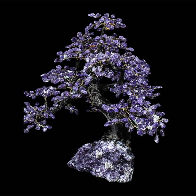 Brings you Handmade Amethyst Gemstone trees with a crystal cluster base, resin trunk, wired branches and tumbled Amethyst gemstones.