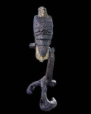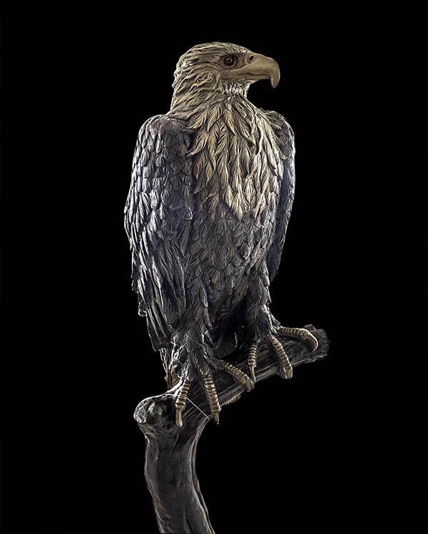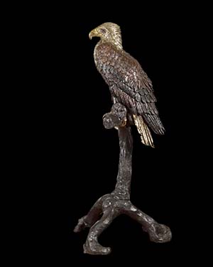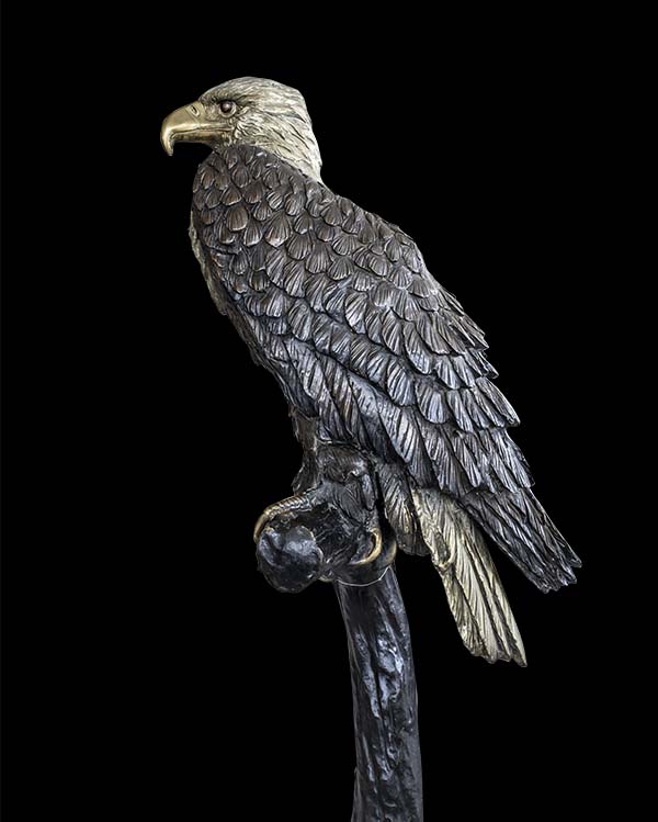 Perched with quiet dominance, the eagle’s finely detailed feathers and penetrating gaze evoke strength and clarity, while the rich bronze patina lends depth, warmth, and an aged elegance. The organically sculpted base enhances the natural narrative, creating a harmonious balance between form and symbolism.