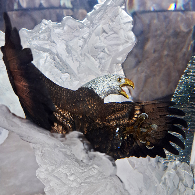 This original Lucite bronze Eagle can be displayed near a window for natural sunlight, under lamps directed at it, or a pedestal that lights the sculptures from below. Each illumination creates a striking, new effect.
