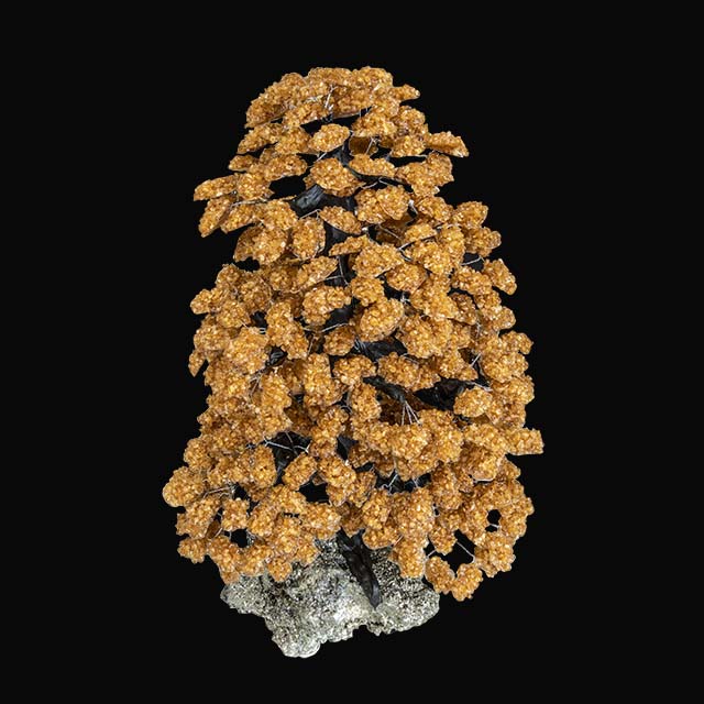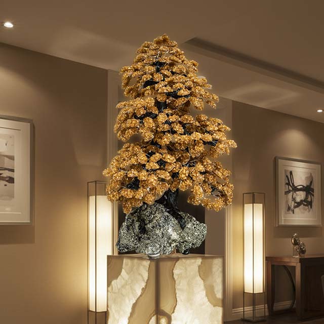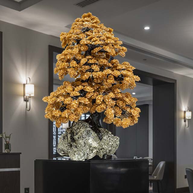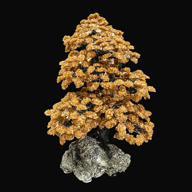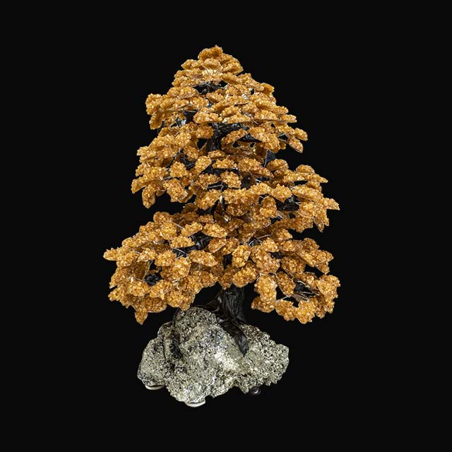 The cultivation of bonsai trees is an ancient Japanese art form inspiring harmony and the concept of wabi-sabi, or imperfect beauty. This stunning bonsai tree grows not leaves but depicts Natural Citrine instead. The base of the tree features a stunning Natural Amethyst geode. Â Amethyst is regarded as a healing gem, one which protects against negative energy and encourages spiritual growth. Citrine is associated with prosperity and wealth believed to carry positive energy, promoting creativity, joy, and abundance. A plant you’ll never have to trim or water, let this tree be a peaceful and positive influence in your home.