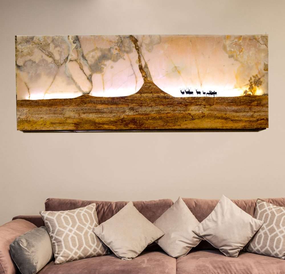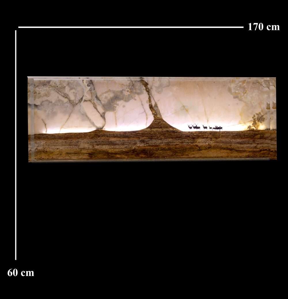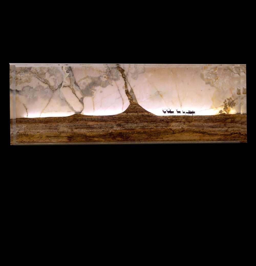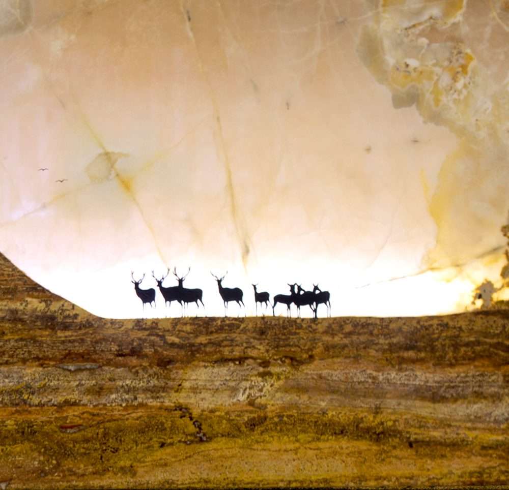 This captivating and artistic wall display melds the inherent beauty of natural Onyx with the elegant image of graceful deer. The natural Onyx Stone is meticulously hand-crafted with detailed deer motifs and illuminated from behind, creating a warm and enchanting radiance throughout the design. This display serves both as a decorative piece and functional lighting, making it a captivating addition to rustic or nature-inspired decor. This blend of art and illumination not only celebrates the beauty of deer but also adds an element of serenity and visual allure to interior settings.