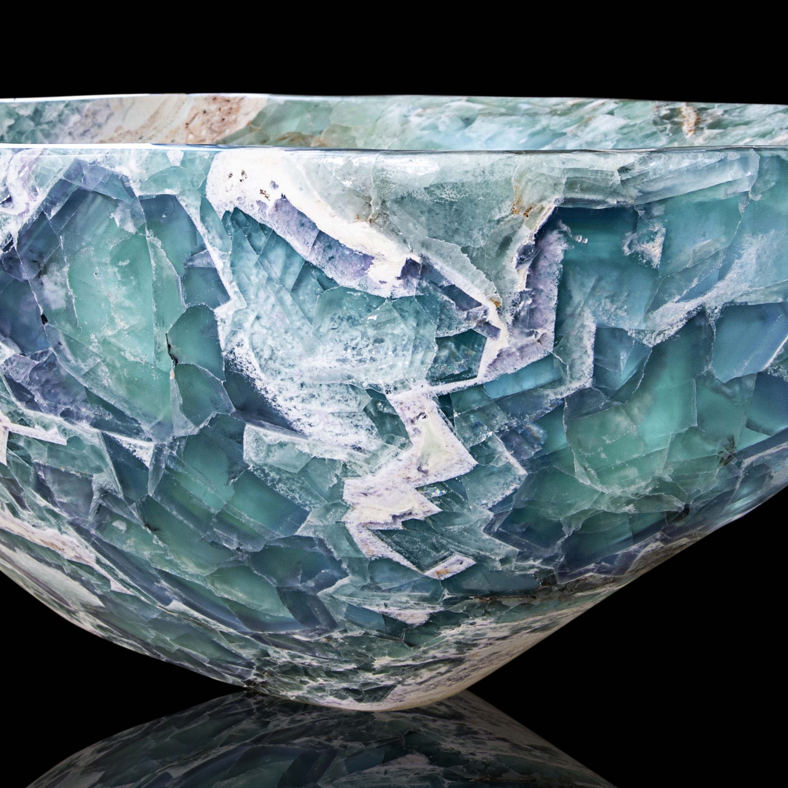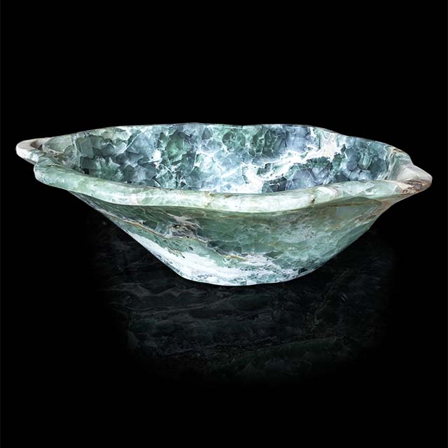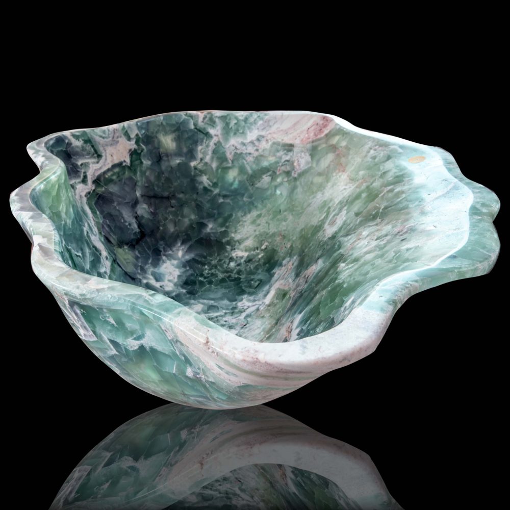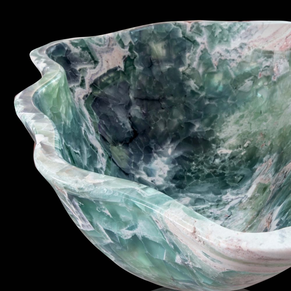 This bowl features stunning “rainbow” banding with exquisite purple and green hues and a rustic rim.  When backlit, the bowl truly pops with color and glows due to the stone’s transparency.
