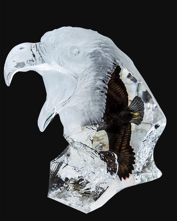 The eagle is masterfully crafted from fine metals and finished with a rich bronze patina. It is uniquely encased within a hand-carved block of optical-grade Lucite, which is expertly shaped into the profile of a larger eagle’s head. This dual-layer design creates a ‘sculpture within a sculpture’ effect, symbolizing the spirit and vision of the great bird. Each piece is handmade in the USA, ensuring that the hand-cut ‘ice’ textures of the Lucite are unique to every individual collector”.