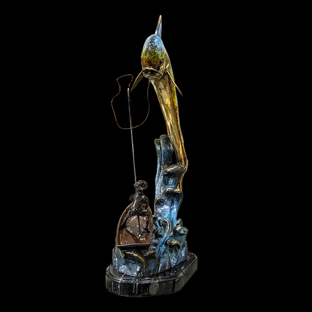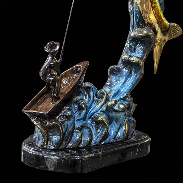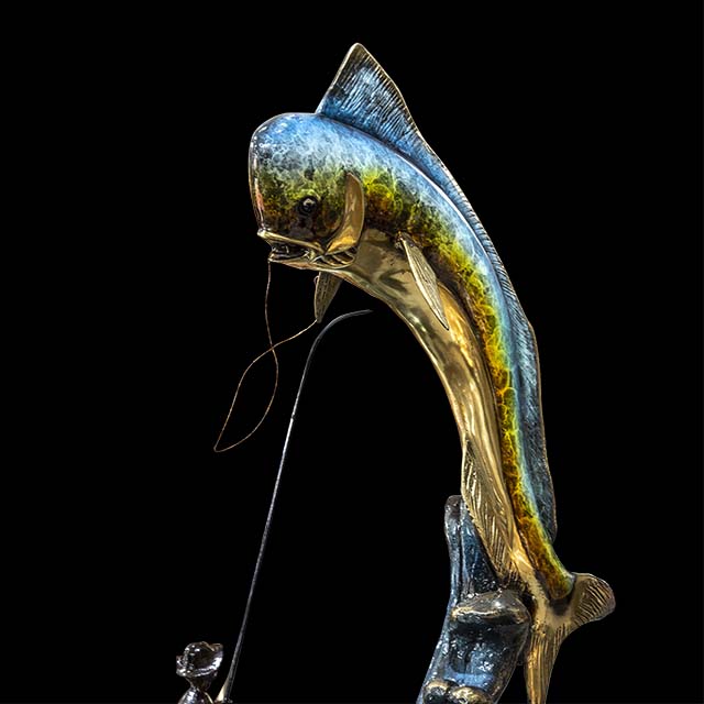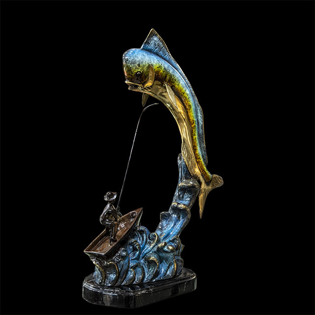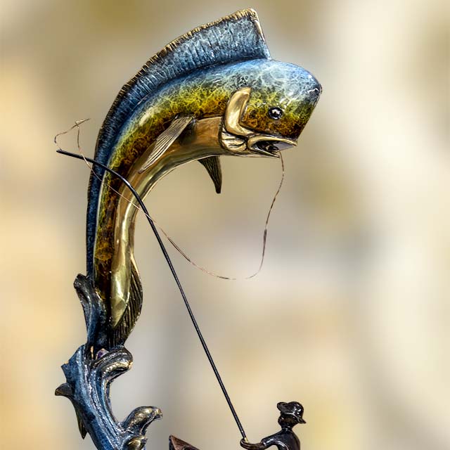 Celebrate the thrill of the open sea with this striking Mahi Mahi bronze sculpture, capturing a powerful moment between man and nature. The dynamic composition showcases a fisherman skillfully reeling in a majestic Mahi Mahi as it leaps gracefully from sculpted ocean waves—frozen in motion with remarkable detail and artistry.