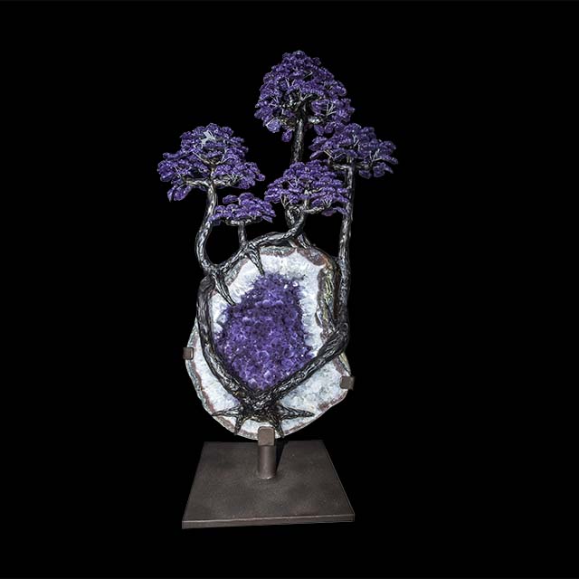 The cultivation of trees of life is an ancient Japanese art form inspiring harmony and the concept of wabi-sabi, or imperfect beauty. This stunning bonsai tree grows not leaves but depicts Natural Amethyst instead. The base of the tree features a stunning Natural Smoky Quartz geode. Amethyst is regarded as a healing gem, one which protects against negative energy and encourages spiritual growth. Smoky Quartz is valued for its grounding and protective properties, believed to absorb and transmute negative energy, and is associated with fostering a sense of balance, protection, and serenity. A plant you’ll never have to trim or water, let this tree be a peaceful and positive influence in your home.