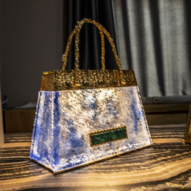 The Bloom Glass Glow Bag with USB Port is a striking fusion of functional innovation and artistic luxury. Crafted from textured artisan glass and finished with shimmering gold accents, this sculptural bag transforms everyday utility into a statement of elegance. Its unique glass construction gives it a radiant, crystalline appearance that captures and reflects light, making it a standout décor piece or collector’s item.