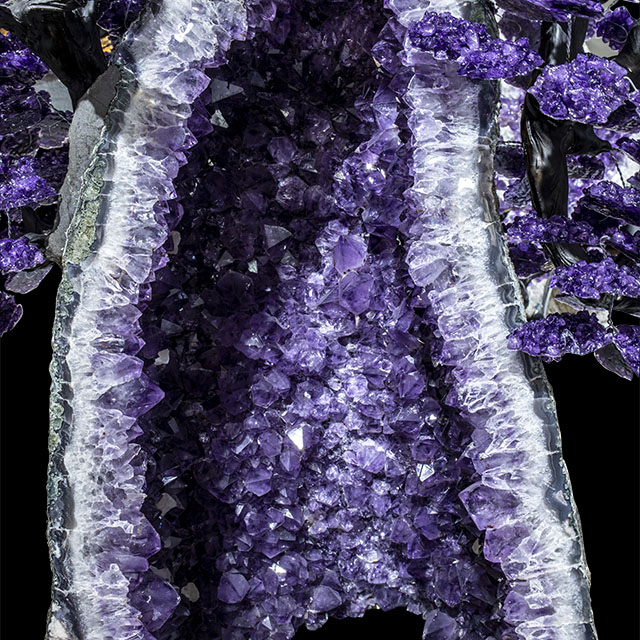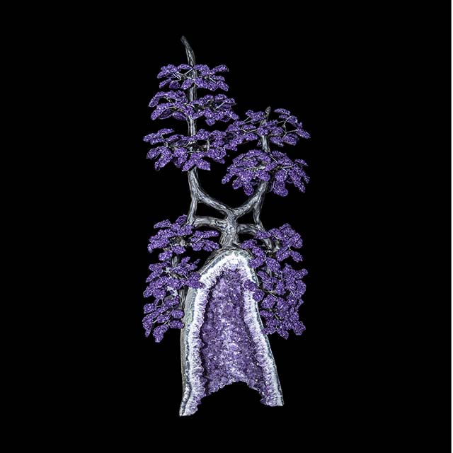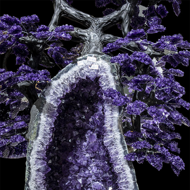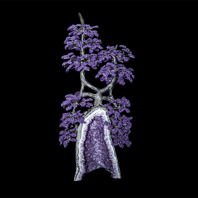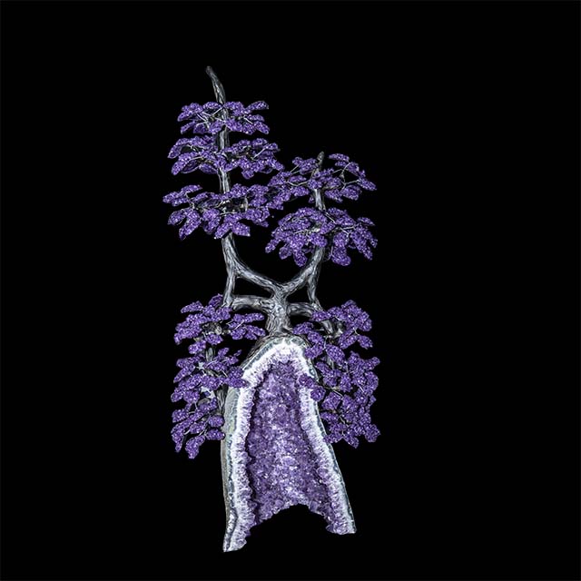 Beneath the tree, the natural amethyst geode opens into a breathtaking cluster of sparkling violet crystals—each one formed over millions of years. The combination of sculpted metal branches and organic crystal formations creates a powerful visual harmony, blending artistic craftsmanship with the raw beauty of the Earth.