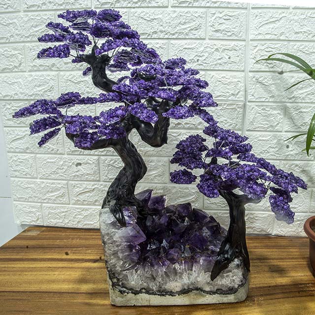 The cultivation of bonsai trees is an ancient Japanese art form inspiring harmony and the concept of wabi-sabi, or imperfect beauty. This stunning bonsai tree grows not leaves but depicts Natural Amethyst instead. The base of the tree features a stunning Natural Smoky Quartz geode. Amethyst is regarded as a healing gem, one which protects against negative energy and encourages spiritual growth. Smoky Quartz is valued for its grounding and protective properties, believed to absorb and transmute negative energy, and is associated with fostering a sense of balance, protection, and serenity. A plant you’ll never have to trim or water, let this tree be a peaceful and positive influence in your home.
