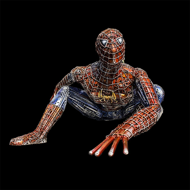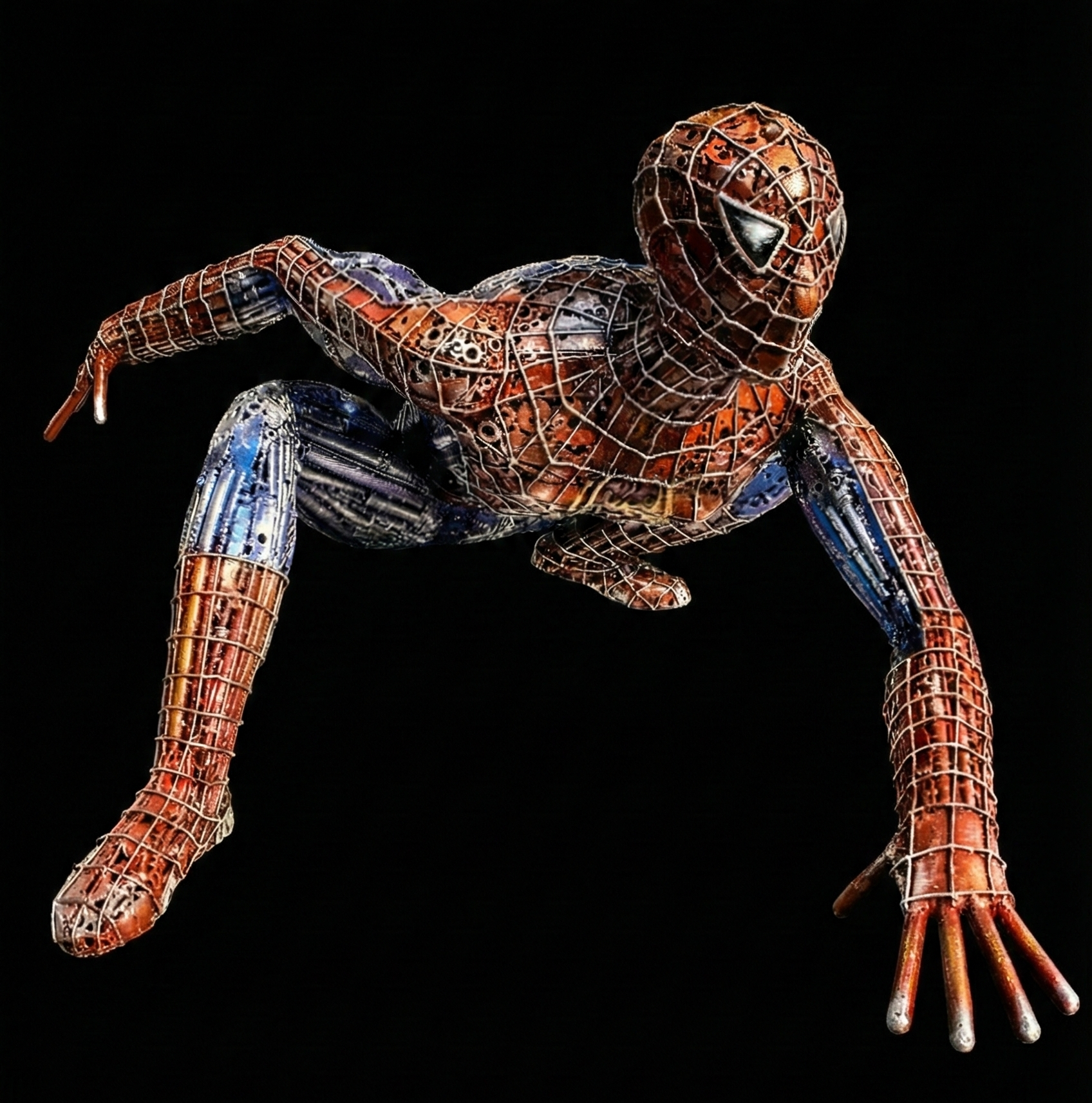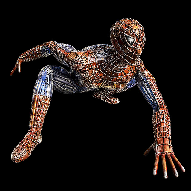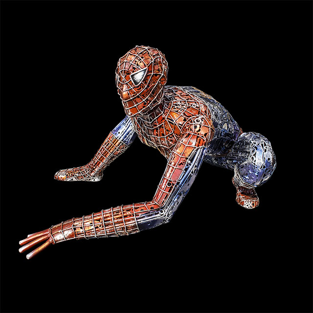 Each element of the suit is meticulously shaped from welded metal pieces, creating a bold industrial aesthetic that blends art, craftsmanship, and pop-culture nostalgia. The textured metallic webbing, vivid tones, and mechanical layers give the sculpture a futuristic, almost robotic character, making it a true statement piece for collectors and enthusiasts.
