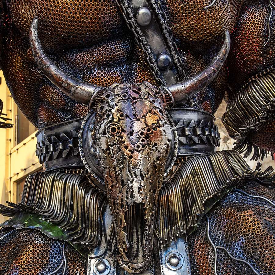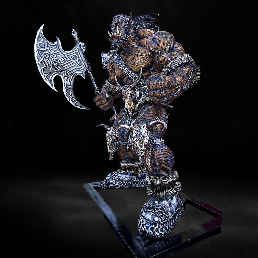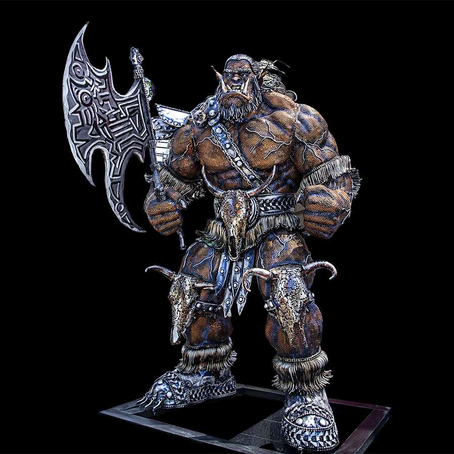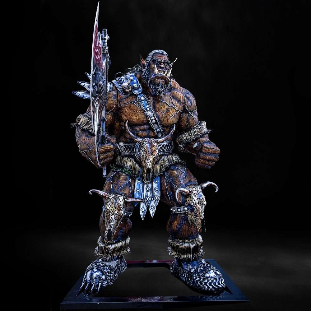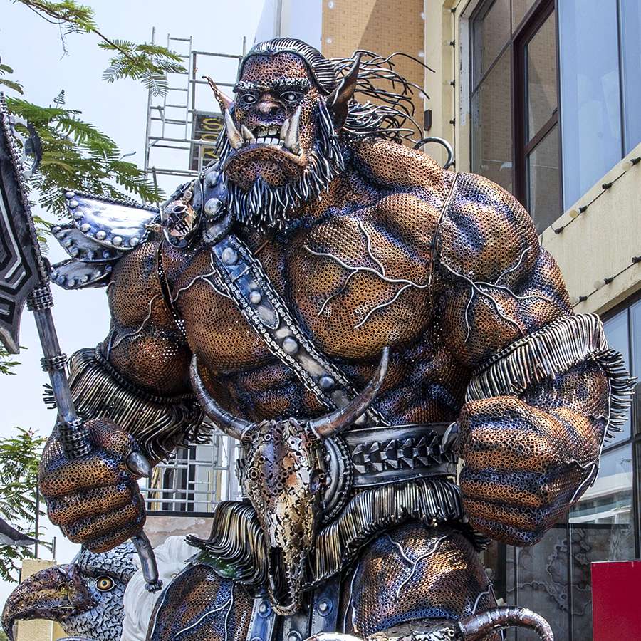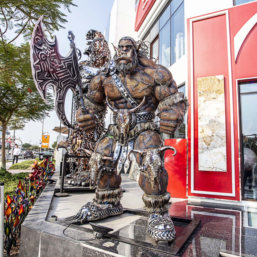 This unique sculpture crafted from salvaged metal materials, transformed into a fierce and captivating representation of an Orc, known for its intricate details and sustainability-driven design.
