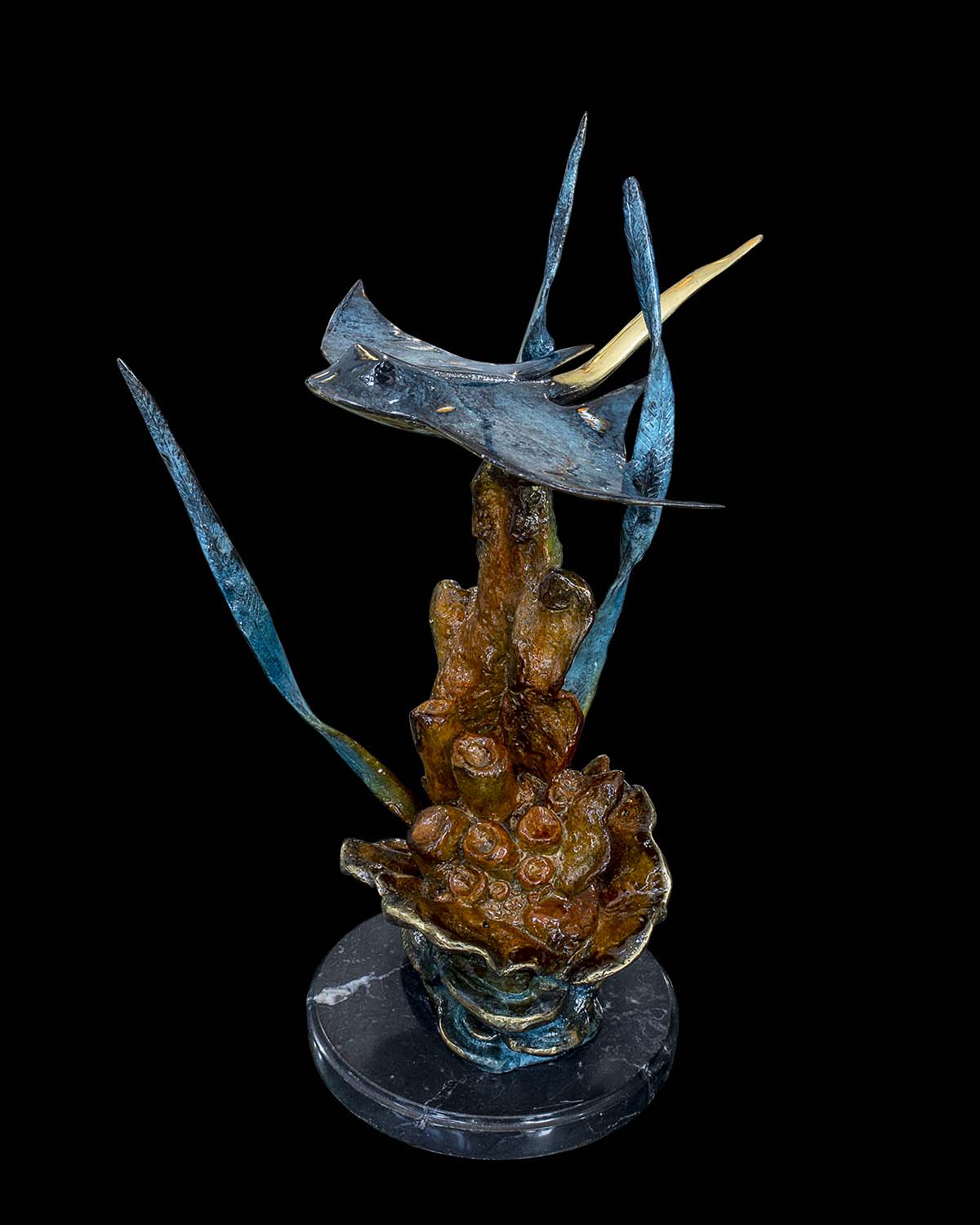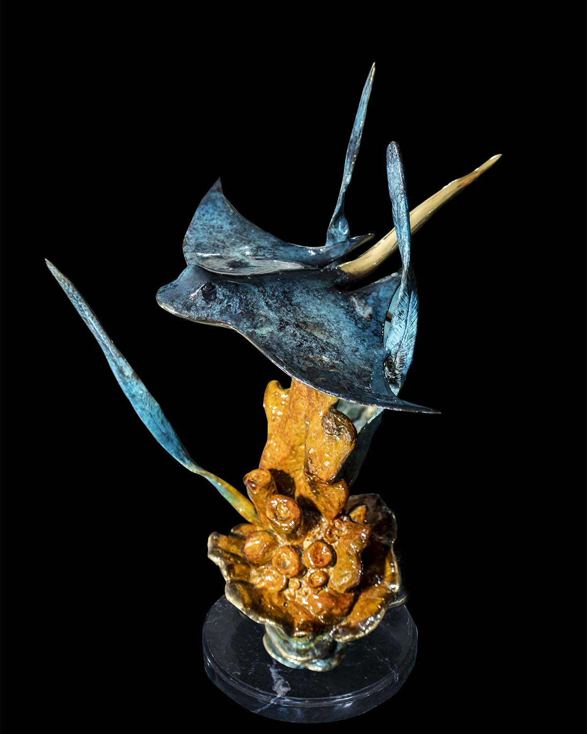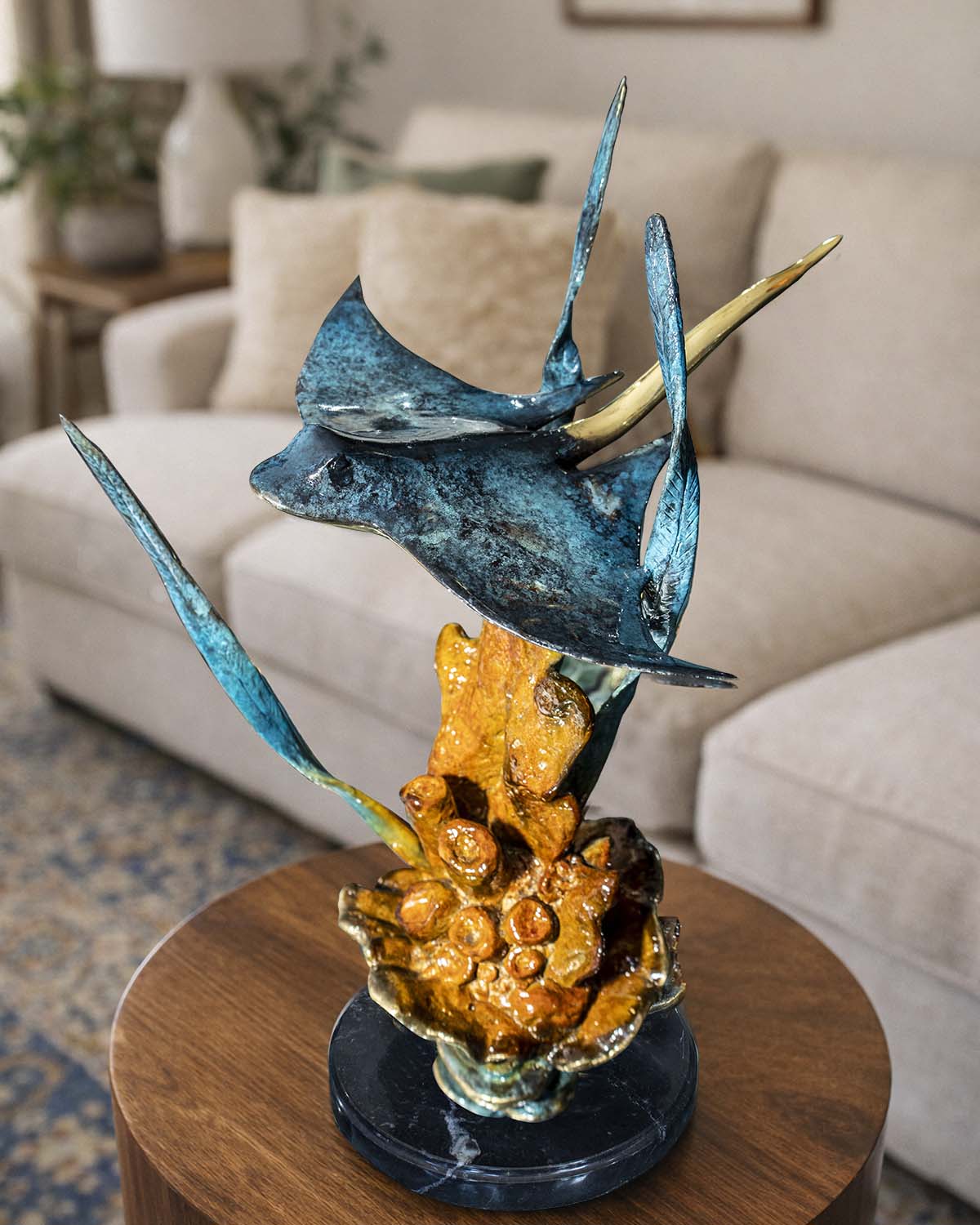The Movement: Unlike static wildlife art, Marius focuses on “The Flow.” The rays are positioned at dynamic angles, appearing to bank through invisible currents, supported by stylized bronze “seaweed” that adds verticality and grace.