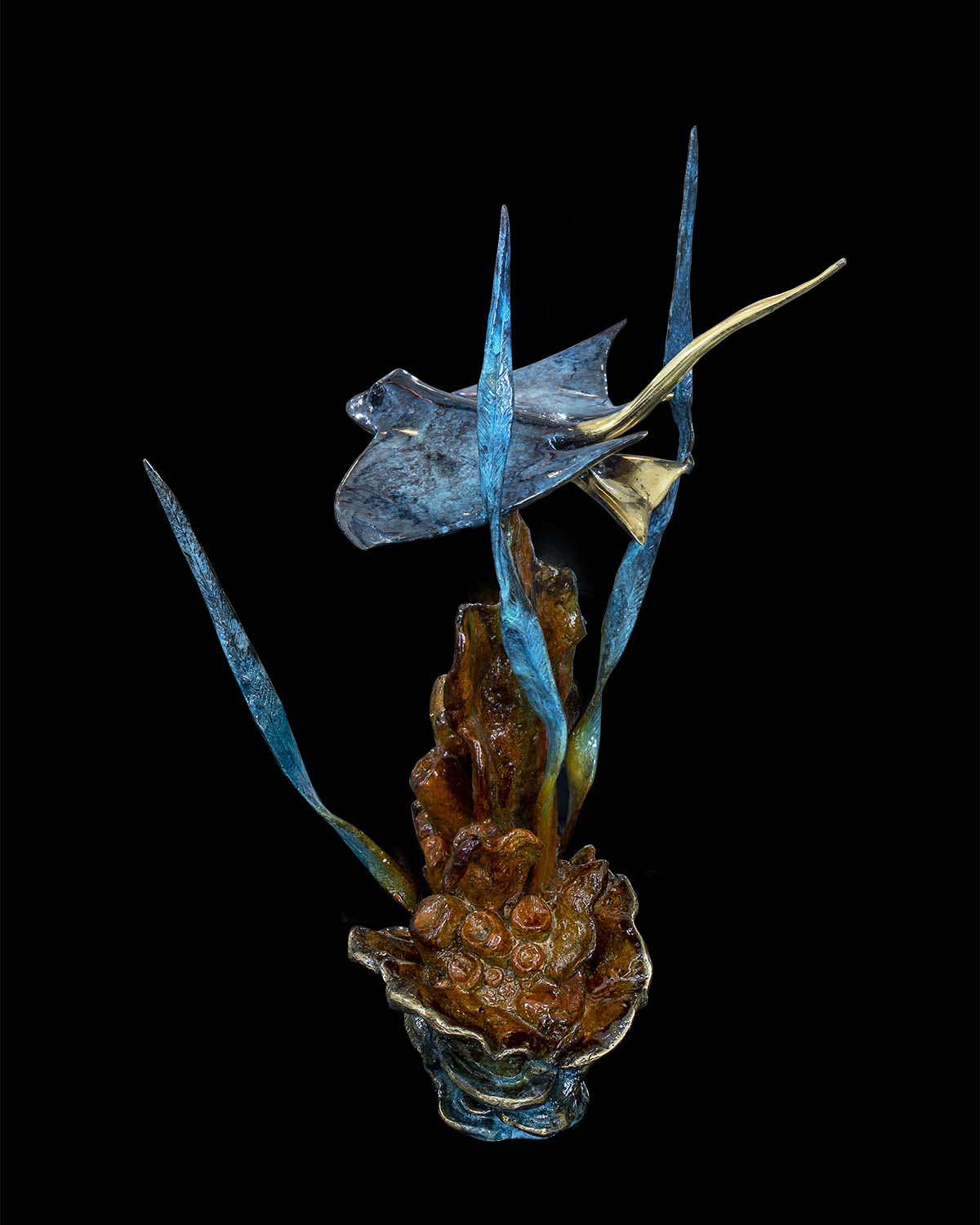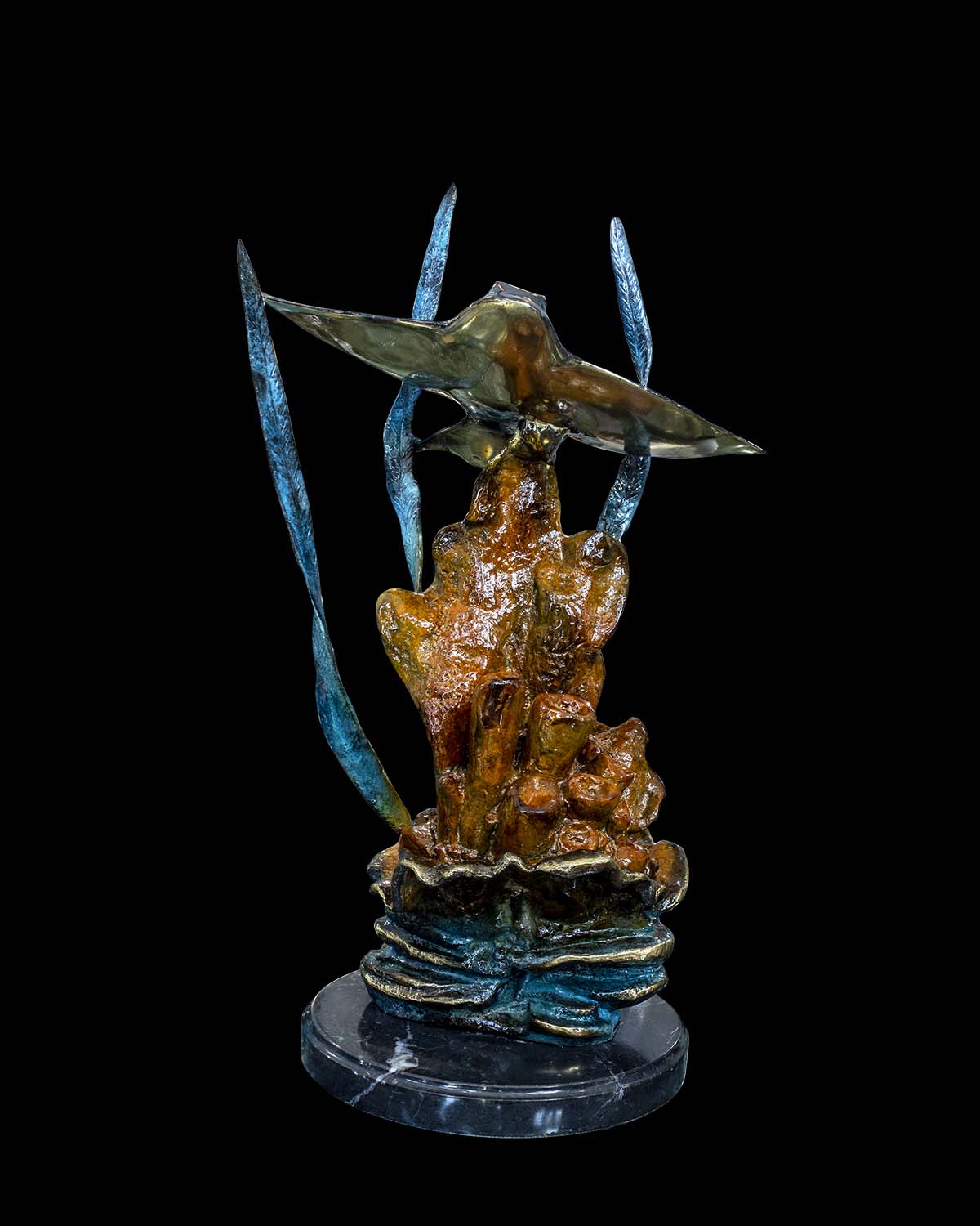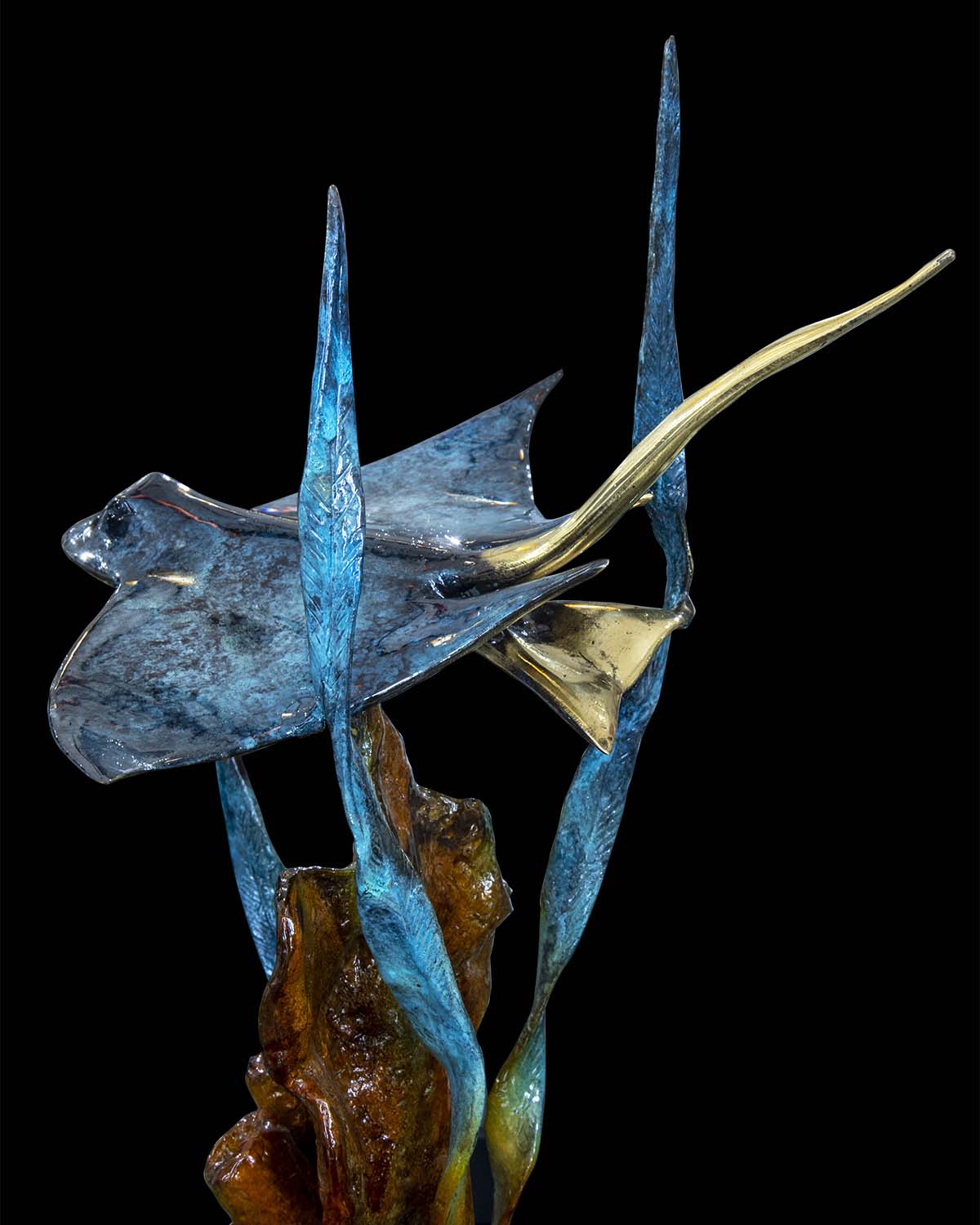The Movement: Unlike static wildlife art, Marius focuses on “The Flow.” The rays are positioned at dynamic angles, appearing to bank through invisible currents, supported by stylized bronze “seaweed” that adds verticality and grace.