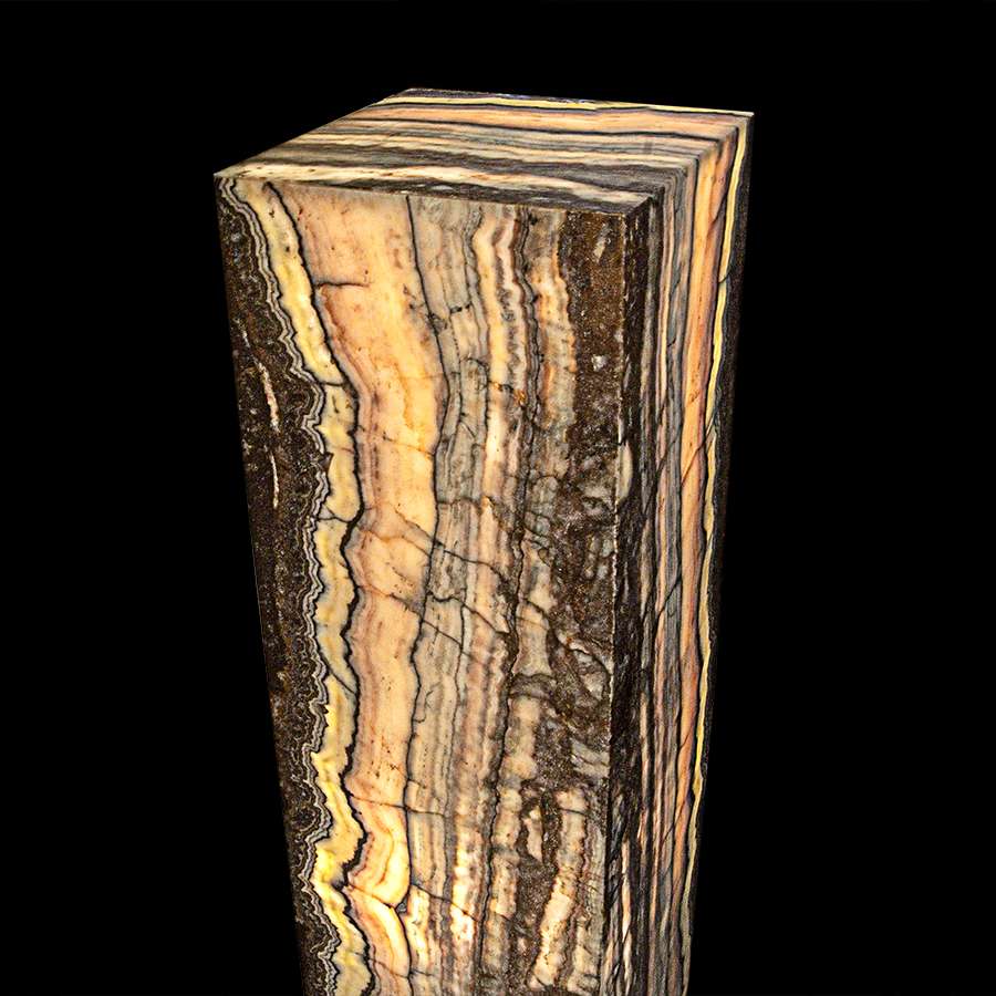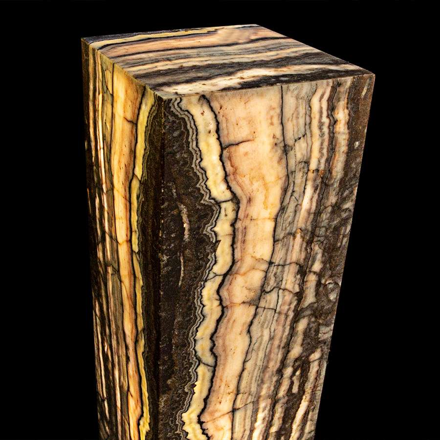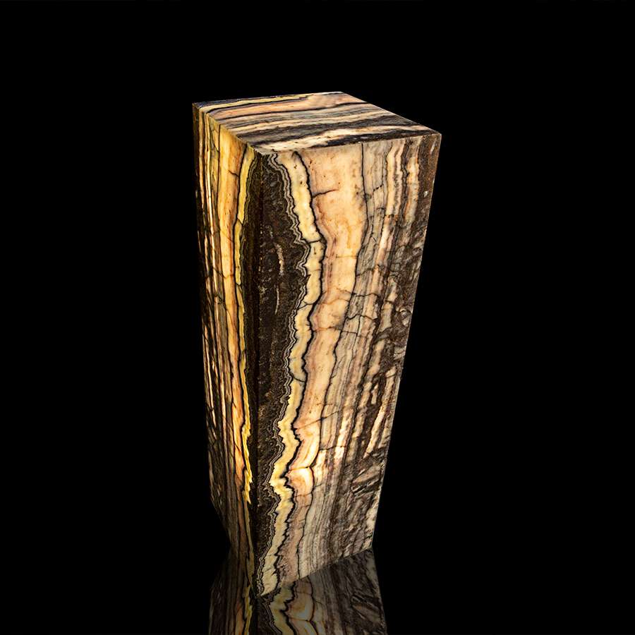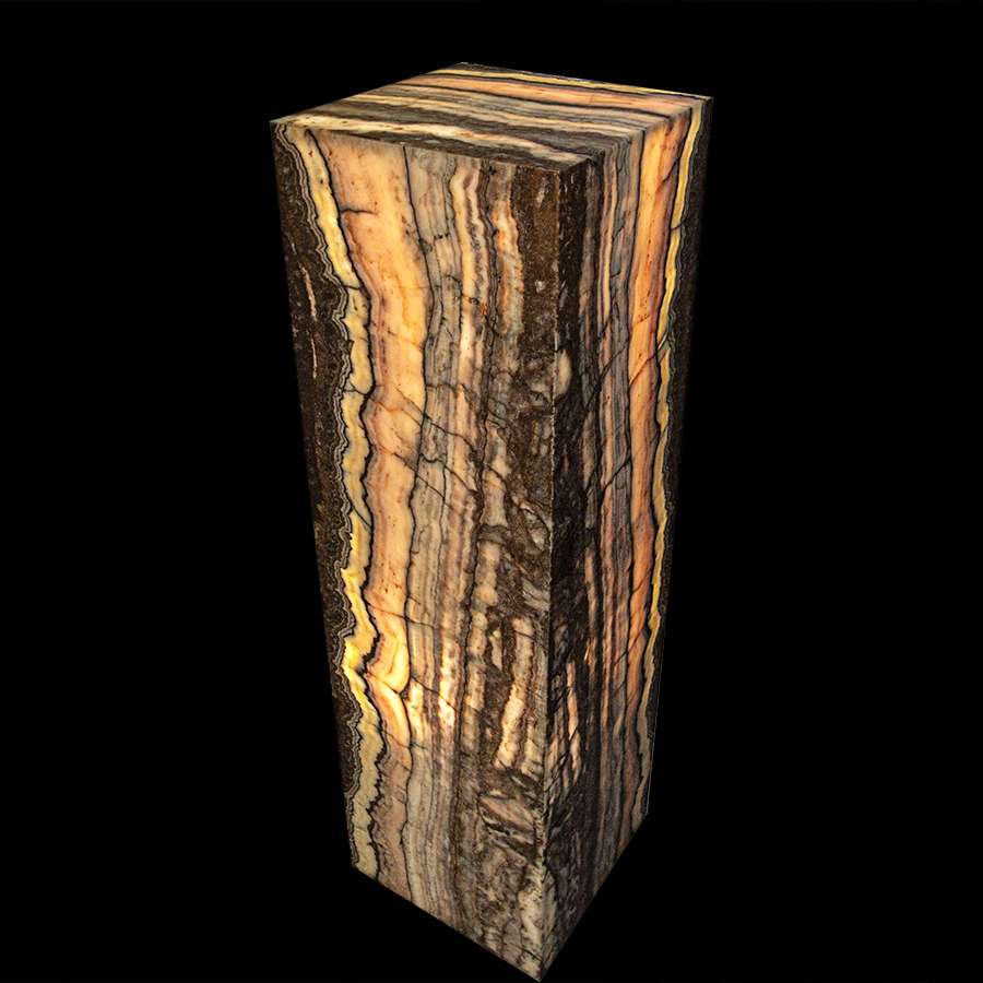 This stunning and luminous piece of decor features a tower-shaped structure hand-crafted from natural translucent Onyx. When illuminated from within, this Onyx emits a warm and enchanting glow, casting a soft and captivating light throughout the room. This Onyx tower serves both as a decorative and functional lighting element, making it an elegant addition to various settings. Their combination of art and illumination not only adds a touch of opulence but also infuses spaces with a sense of sophistication and visual allure. This unique structure can stand as an artful focal point, enhancing the ambiance of any setting.