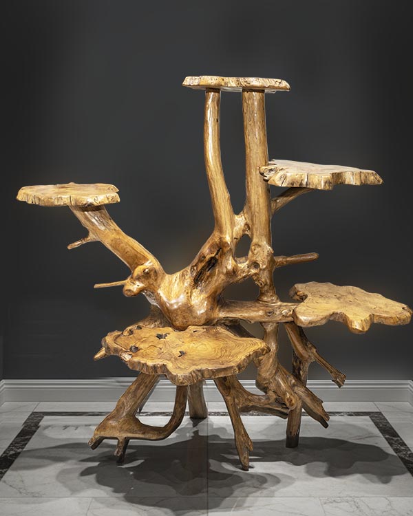 Root Reverie⢠Multi-Tier Teak Sculpture is a striking celebration of natureās raw elegance. Hand-carved from solid reclaimed teak, this sculptural piece unfolds vertically like a living tree, revealing organically shaped platforms that honor the woodās natural grain, knots, and movement.