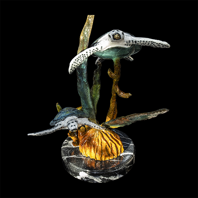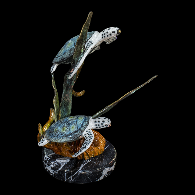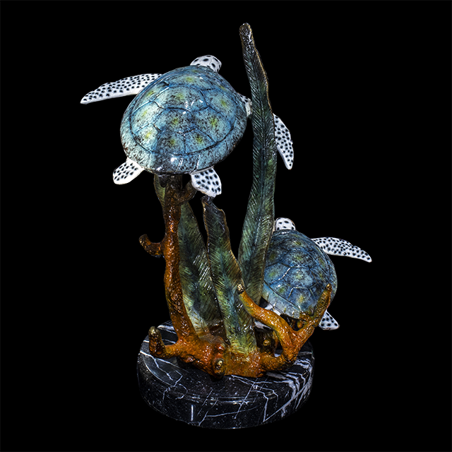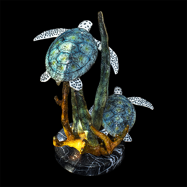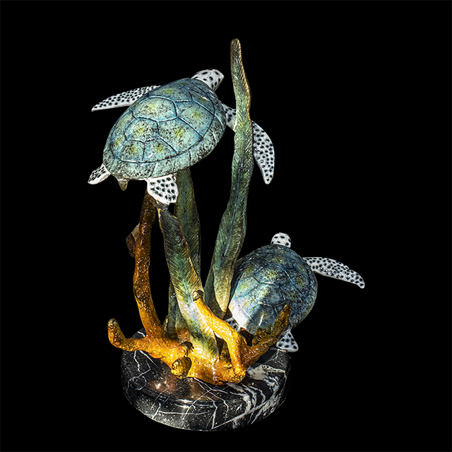 This is a specific bronze sculpture that features a two of sea turtles swimming gracefully amongst coral.