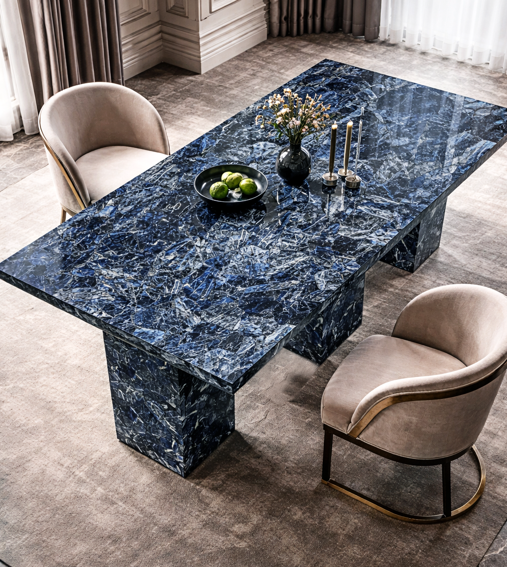 The XXL Sodalite Dining Table is a masterpiece of natural artistry and architectural design. Crafted from striking deep-blue sodalite stone with intricate mineral veining, this table transforms any space into a refined luxury setting. Designed for collectors, designers, and statement interiors, each piece is uniquely patterned by nature — no two are alike. A true fusion of raw earth and elevated craftsmanship, available exclusively at DIVA GALLERY.