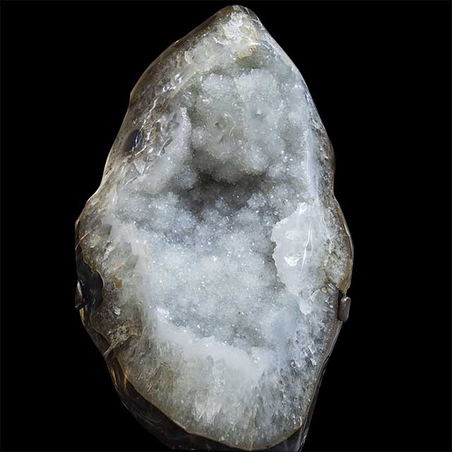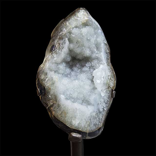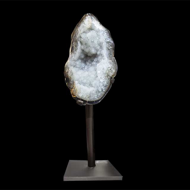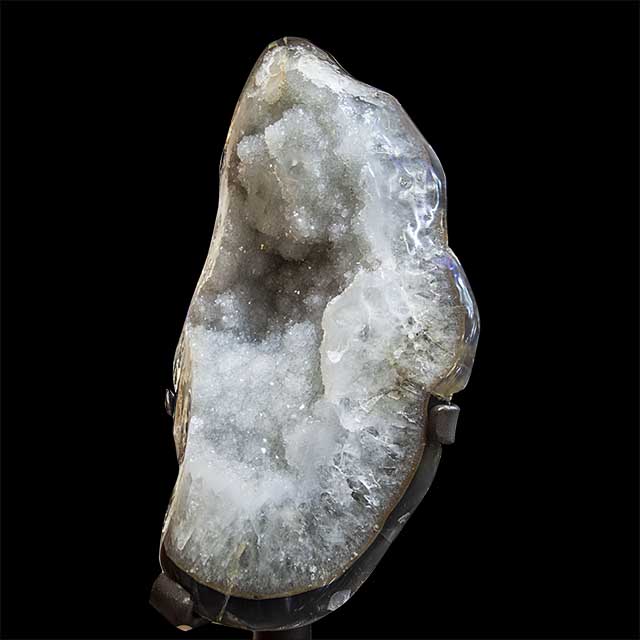 The Natural White Amethyst Geode on this piece are bright white with Stalactite Formation. White Quartz is a type of Amethyst, known for attracting positive energy and promoting peace.