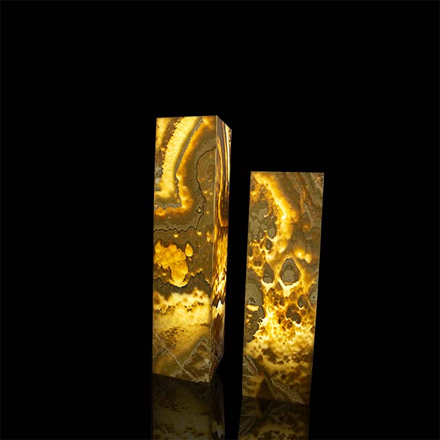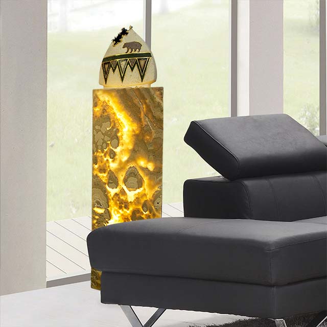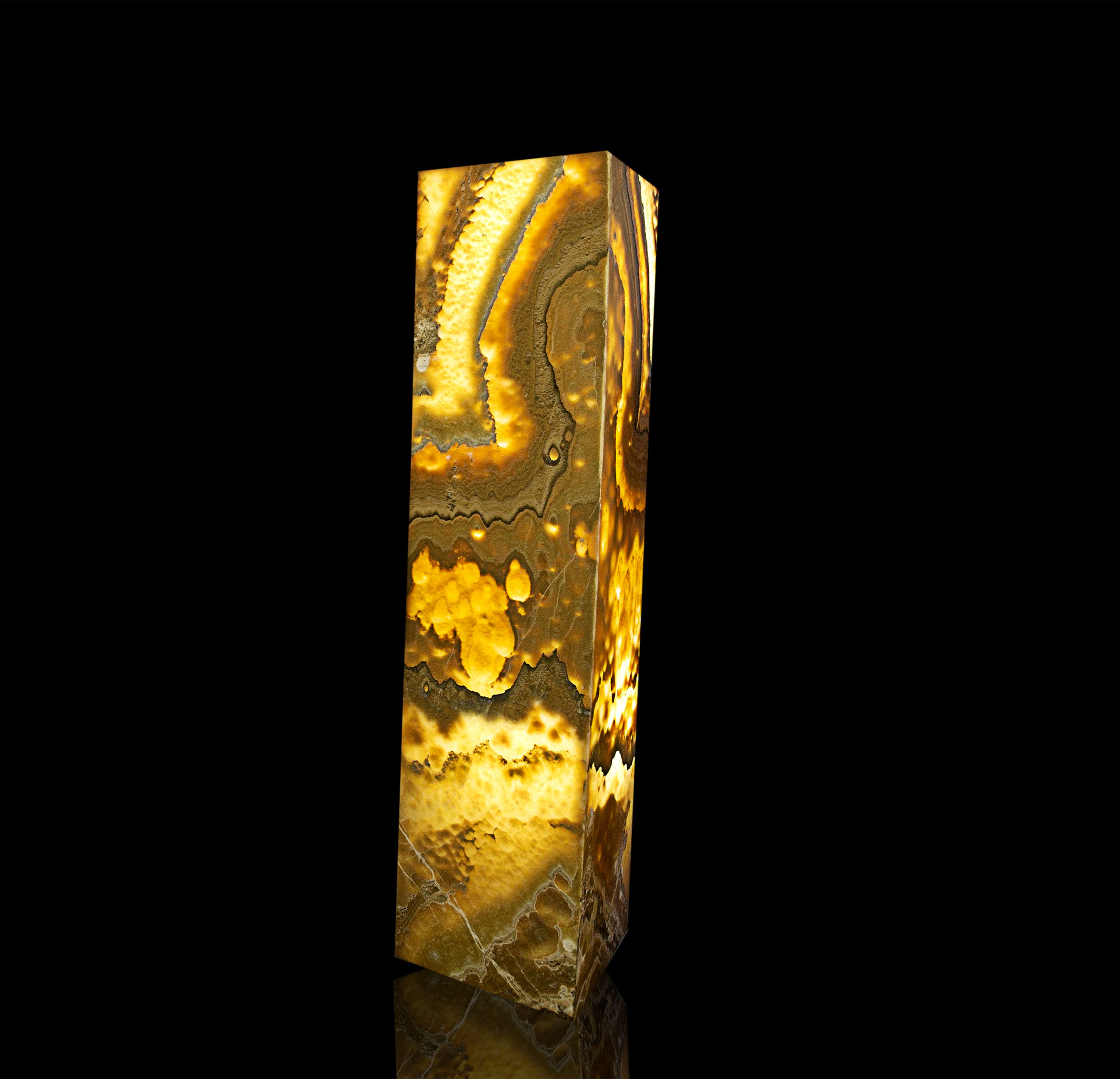 This stunning and luminous piece of decor features a tower-shaped structure hand-crafted from natural translucent Onyx. When illuminated from within, this Onyx emits a warm and enchanting glow, casting a soft and captivating light throughout the room. This Onyx tower serves both as a decorative and functional lighting element, making it an elegant addition to various settings. Their combination of art and illumination not only adds a touch of opulence but also infuses spaces with a sense of sophistication and visual allure. This unique structure can stand as an artful focal point, enhancing the ambiance of any setting.