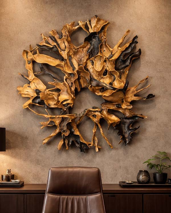 Teak Root of Authority™ is a sculptural teak root wall artwork that embodies balance, strength, and intentional stillness. Naturally shaped by time and refined by hand, its flowing organic form introduces warmth and depth into modern interiors dominated by technology and straight lines.