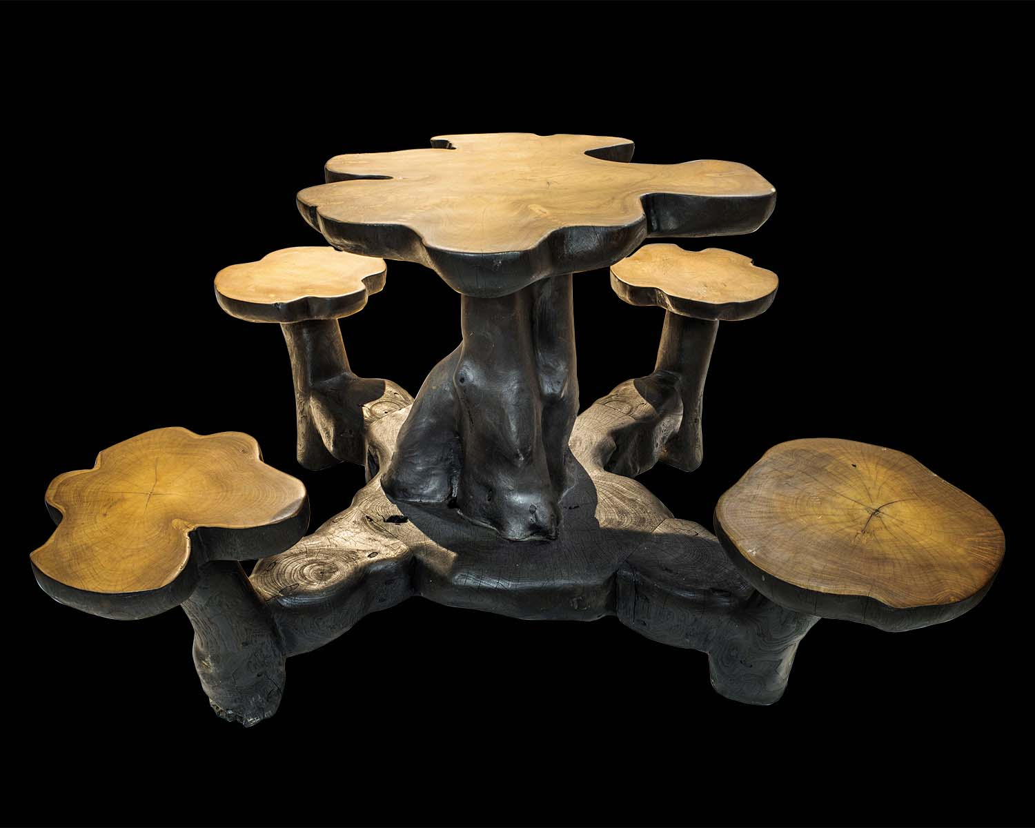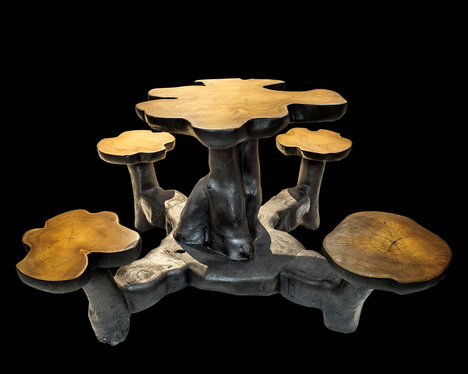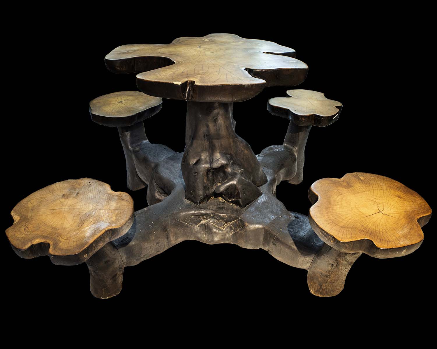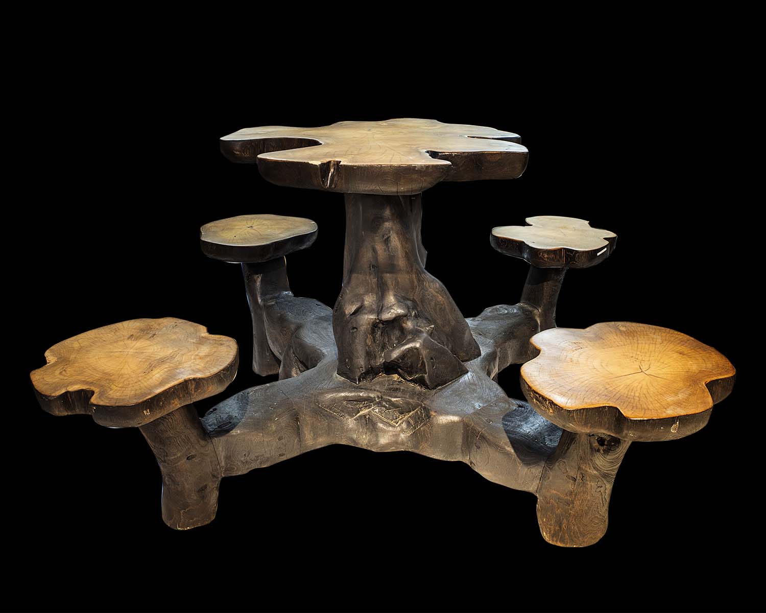 Each curve, grain, and contour is shaped by nature and refined by skilled craftsmanship, resulting in a sculptural centerpiece that commands attention. The organically contoured tabletop is supported by a dramatic root base, while the accompanying seats echo the same natural silhouette—creating a harmonious, grounded design.