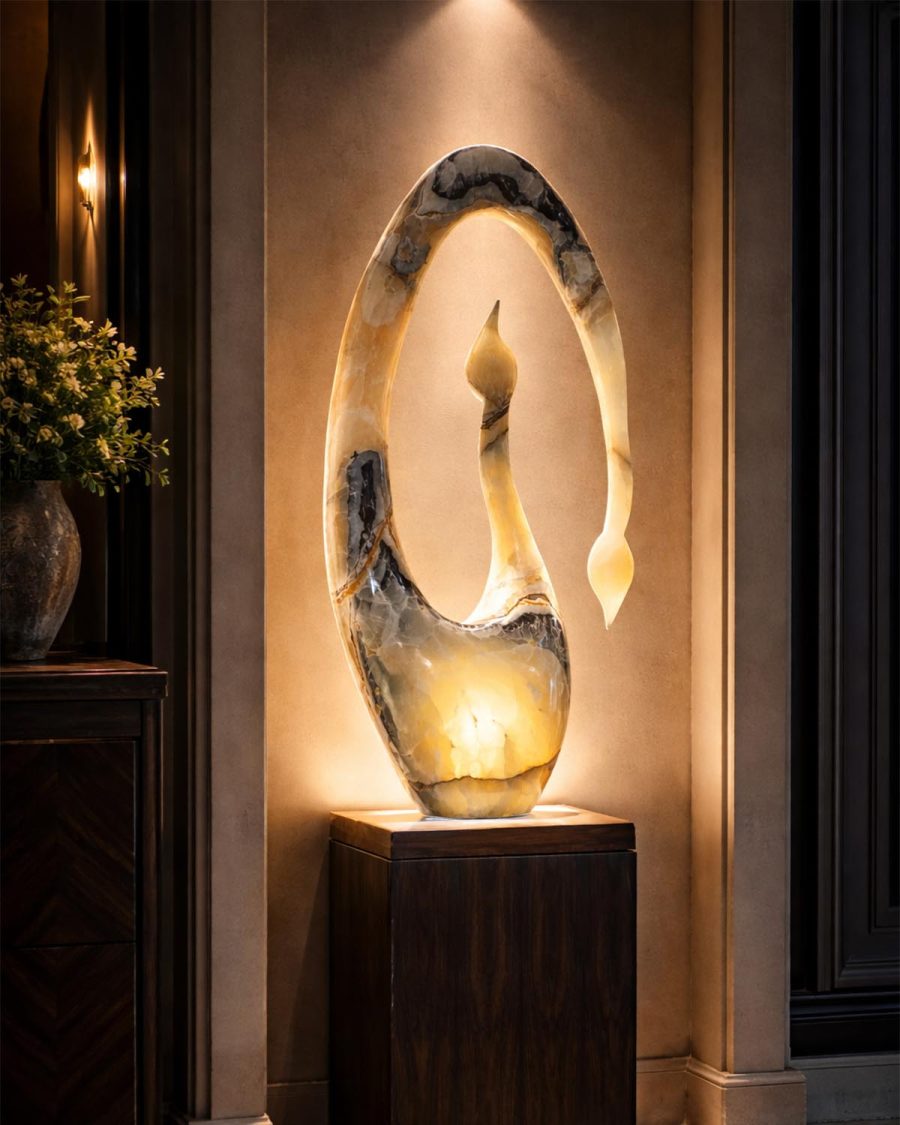 Crafted from premium natural onyx, this sculpture possesses a unique translucency that allows light to softly penetrate its surface.
