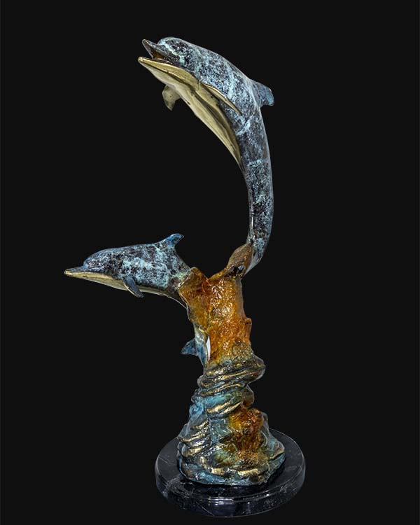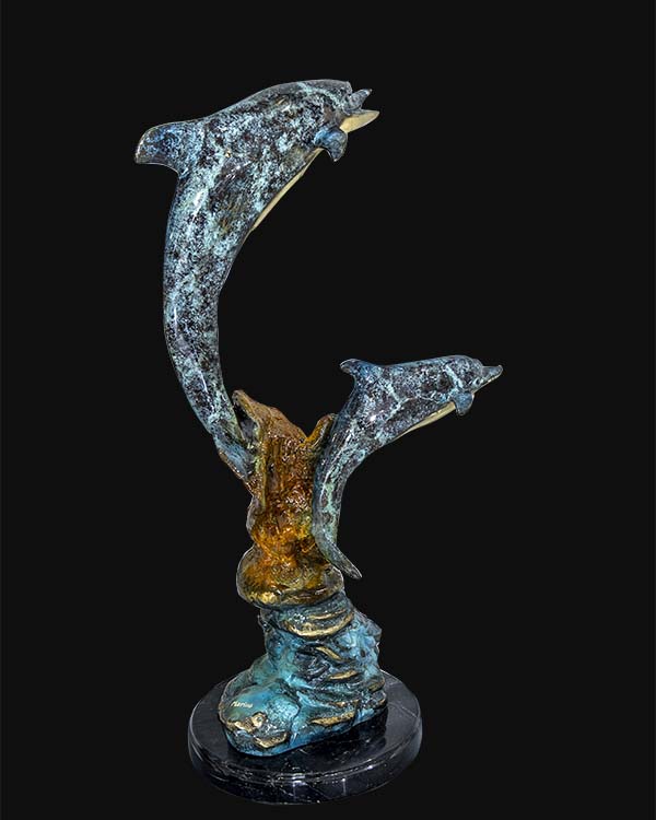 Finished with a rich patina of oceanic blues and verdigris tones, the sculpture rests on a sculpted base that evokes waves carved by time. Every curve reflects balance and momentum—an artwork that feels alive from every angle.